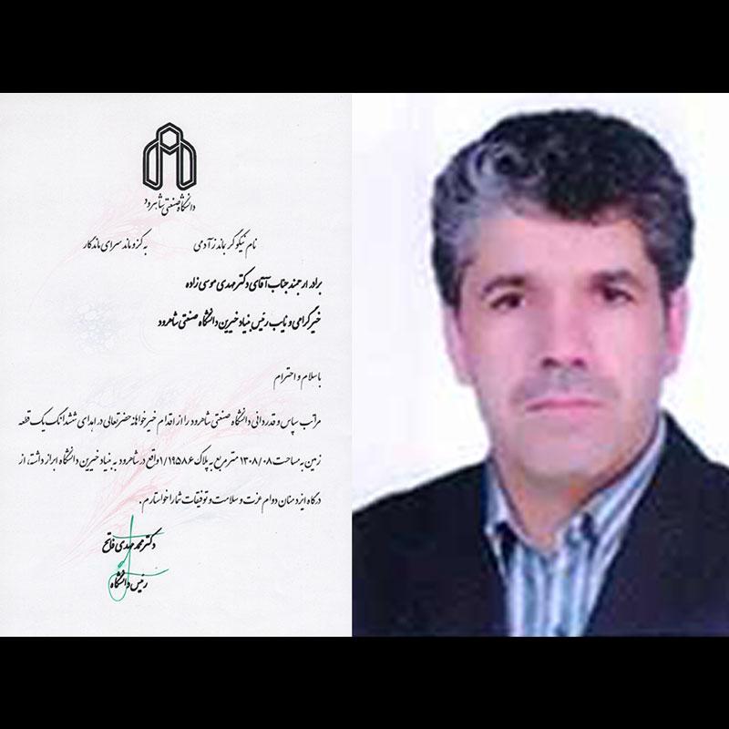 به گزارش روابط عمومی دانشگاه صنعتی شاهرود، دکتر مهدی موسی زاده خیر و نائب رئیس بنیاد خیرین این دانشگاه زمینی به مساحت 08/ 1308مترمربع به پلاک 1/19586 واقع در شاهرود را به صورت ششدانگ به بنیاد خیرین دانشگاه اهدا نموده است.
