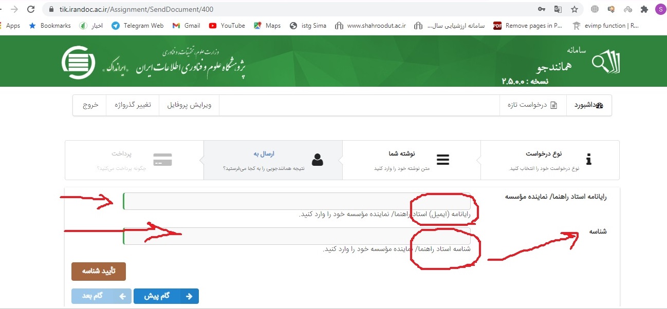 با توجه به اجباري بودن انجام همانند جو، دانشجو بايد در سايت ايرانداك (https://tik.irandoc.ac.ir/User/Login) ثبتنام كند. در فرآيند انجام كار براي ارسال پروپوزال/ پاياننامه/ رساله نياز به معرفي دو آيتم زير مربوط به استاد راهنماي دانشجو است كه بايد توسط استاد راهنما به دانشجو داده شود تا در بخش مربوطه در سايت ايرانداك وارد شود (فايل تصوير پيوست): 1- رايانامه استاد راهنما/ نماينده مؤسسه 2-شناسه توجه1: بعد از اينكه دانشجو مراحل انجام كار همانند جو را انجام داد، استاد راهنما مي تواند وارد سايت ايرانداك (https://tik.irandoc.ac.ir/User/Login) شود و نتايج را ببيند.
