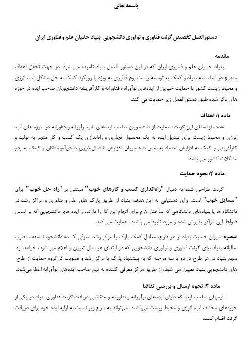 دستورالعمل تخصیص گرنت فناوری و نوآوری دانشجویی بنیاد حامیان علم و فناوری ایران