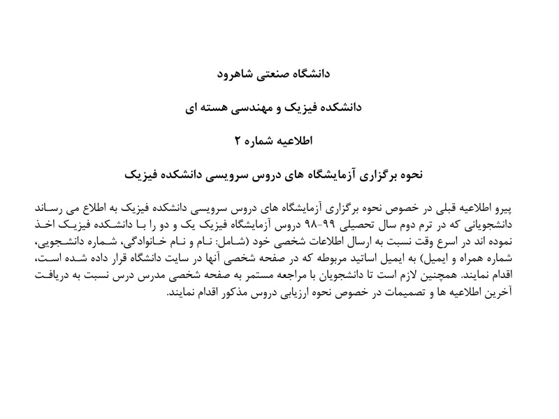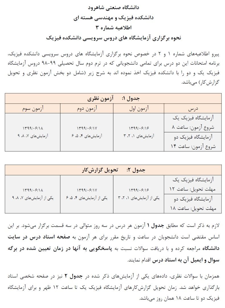 توضیحات پیرامون زمان و مراحل برگزاری آزمون و همچنین تحویل گزارش کار. دانشجویان عزیز دقت فرمایید که آزمون به صورت سه مرحله در سه روز پیاپی برگزار میگردد. سوالات راس ساعت برگزاری آزمون در همین صفحه (https://shahroodut.ac.ir/fa/as/?id=S1023) بارگذاری میگردد. در هر یک از روزهای آزمون، پس از پاسخ گویی به پرسش ها، پاسخ های خود را در قالب یک فایل منحصرا به آدرس ارائه شده توسط اینجانب (majid.moradi@shahroodut.ac.ir) ارسال نمایید. دانشجویان توجه فرمایید که پس از ارسال فایل پاسخ خود، باید داده های مربوط به یکی از سه آزمایشی را که در همان روز در سایت بارگذاری شده دانلود کرده و گزارش کار مربوط به آن را آماده کرده و حداکثر تا زمان اعلام شده در فایل پیوست شده به همین اطلاعیه، به آدرس ایمیل اینجانب ارسال کنید.