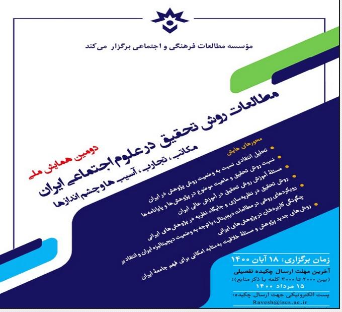 نظر به موسسه مطالعات فرهنگی واجتماعی وزارت علوم تصمیم به برگزاری دومین همایش ملی "مطالعات روش تحقیق در علوم اجتماعی ایران، مکاتب، تجارب، آسیب ها و چشم اندازها" در هجدهم آبان ماه سال جاری با هدف شناسایی وضعیت روش تحقیق در پژوهش های آکادمیک جامعه ایران دارد. لذا علاقمندان جهت دریافت اطلاعات بیشتر می توانند به آدرس http://iscs.ac.ir/blog/2021/08/مطالعات-روش-تحقیق-در-علوم-اجتماعی/ مراجعه نمایند.
