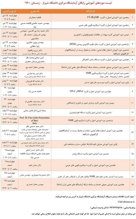 آزمایشگاه مرکزی دانشگاه شیراز در راستای آموزش نیروی انسانی متخصص و آشنا با تجهیزات دارای فناوری بالا و همچنین با هدف انتقال تجارب فنی و عملی به متقاضیان محترم به عنوان یکی از رسالت های خود، کارگاه های آموزشی مرتبط با تجهیزات موجود را برگزار می نماید. به پیوست لیست دوره های آموزشی رایگان زمستان 1400 ارسال می شود.