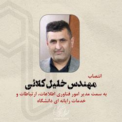 احتراماً؛ با عنایت به بند «الف» ماده «17» آیین نامه جامع مدیریت دانشگاه ها و موسسات آموزش عالی، پژوهشی و فناوری مصوب جلسه 684 شورای عالی انقلاب فرهنگی و پیشنهاد معاون محترم پژوهشی و فناوری به موجب این ابلاغ به مدت دو سال به عنوان مدیر امور فناوری اطلاعات، ارتباطات و خدمات رایانه ای دانشگاه منصوب می شوید تا وظایف و امور محوله را بر اساس آیین نامه جامع مدیریت دانشگاه ها و با هماهنگی معاون محترم پژوهشی و فناوری به انجام رسانید.