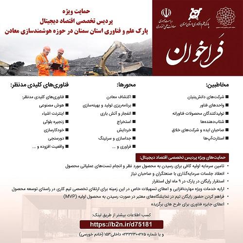پارک علم و فناوری استان سمنان اقدام به فراخوان حمایت ویژه پردیس تخصصی اقتصاد دیجیتال پارک علم و فناوری استان سمنان در حوزه هوشمندسازی معادن در سال 1402 نموده است. بدین وسیله از تمامی فناوران و علاقه مندان بدین حوزه دعوت به عمل می آید.