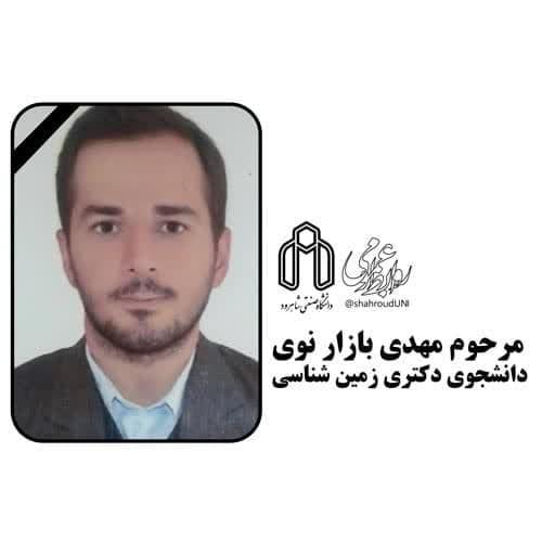 روابط عمومی دانشگاه با قلبی اندوهگین، درگذشت شادروان مهدی بازار نوی دانشجو دکتری دانشکده علوم زمین دانشگاه، را به خانواده داغدار ایشان، دوستان و اعضای خانواده دانشگاه صنعتی شاهرود تسلیت عرض نموده و از پيشگاه حضرت دوست، براي آن مرحوم آمرزش و رحمت واسعه الهي و براي بازماندگان معزز، صبر و اجر و سلامتي مسالت مينماییم.