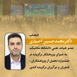 به گزارش روابط عمومی دانشگاه صنعتی شاهرود، بیست و چهارمین جشنواره تجلیل از پژوهشگران و نوآوران برگزیده کشور صبح روز سه شنبه 21 آذر ماه جاری در دانشگاه شهید بهشتی با حضور وزیر علوم برگزار شد و دکتر محمد حسین احمدی عضو هیات علمی دانشکده مهندسی مکانیک این دانشگاه در بیست و چهارمین جشنواره تجلیل از پژوهشگران ،فناوران و نوآوران برگزیده کشور به عنوان پژوهشگر برگزیده انتخاب شد.