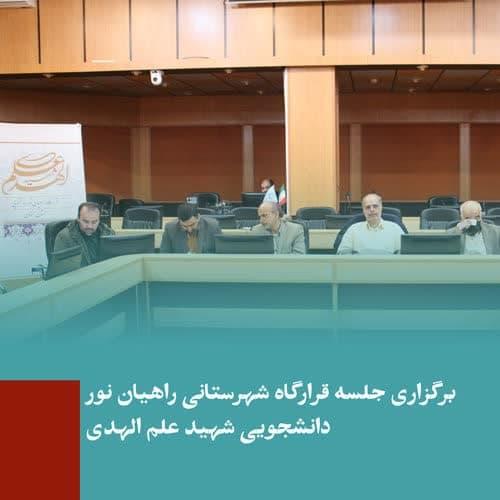 به گزارش روابط عمومی دانشگاه صنعتی شاهرود، جلسه قرارگاه شهرستانی راهیان نور دانشجویی شهید علم الهدی روز چهارشنبه 20 دی ماه جاری با حضور دکتر مرتضی ایزدی فرد رئیس این دانشگاه، دکتر هادی قربانی معاون فرهنگی و اجتماعی و دکتر حسامی مشاور و رئیس دفتر ریاست و مدیر روابط عمومی دانشگاه صنعتی، مهندس هاشمی معاون سیاسی امنیتی فرماندار شاهرود، بخشیان فرمانده بسیج دانشجویی استان سمنان و دبیر استانی قرارگاه شهید علم الهدی، موسوی مسئول بسیج دانشجویی شهرستان شاهرود، دکتر سمیعی رئیس دانشگاه آزاد اسلامی واحد شاهرود، دکتر محمدی رئیس دانشگاه علوم قرآنی شاهرود و دکتر فرامرزی رئیس دانشگاه پیام نور شاهرود در محل سالن اجتماعات کوثر و به میزبانی این دانشگاه برگزار شد.