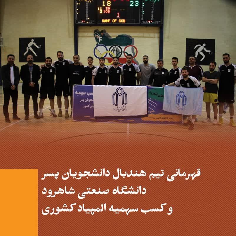 به گزارش روابط عمومی دانشگاه صنعتی شاهرود، مسابقات هندبال دانشجویان پسر منطقه 9 کشور به میزبانی این دانشگاه و با حضور سه تیم در محل سالن فجر دانشگاه واقع در پردیس مرکزی با قهرمانی تیم دانشگاه صنعتی شاهرود از تاریخ 15 بهمن ماه آغاز و در روز چهارشنبه 18 بهمن 1402 به کار خود پایان داد.