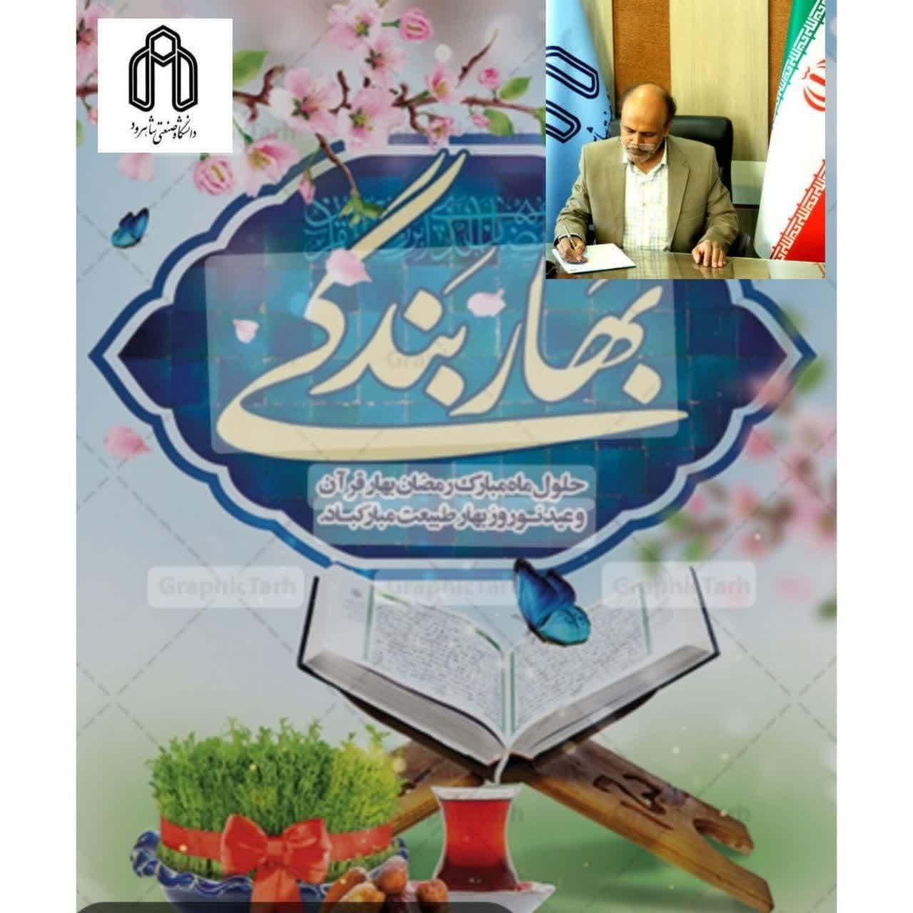 فرا رسیدن نوروز باستانی و آغاز سال نو شمسی و بهار طبیعت و تقارن آن با ماه پر خیر و برکت رمضان را به همه اساتید، یاوران علمی و دانشجویان عزیز دانشگاه صنعتی شاهرود تبریک و تهنیت عرض می نمایم و امیدوارم به توفیق الهی همگی از برکات ایام و مناسبت های پرفیض ماه مبارک رمضان به ویژه شب های قدر به عنوان فرصتی جهت اعتلای معنوی و اخلاقی و نیل به مراتب عالی تزکیه نفس بهره مند گردیم.