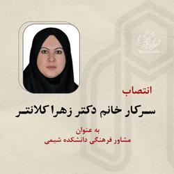 به گزارش روابط عمومی دانشگاه، طی حکمی از سوی دکتر مرتضی ایزدی فرد رئیس این دانشگاه، ضمن تقدیر از دکتر فاطمه مصدالامور در کسوت مشاور فرهنگی دانشکده، دکتر زهرا کلانتر به عنوان مشاور فرهنگی دانشکده شیمی منصوب گردید .