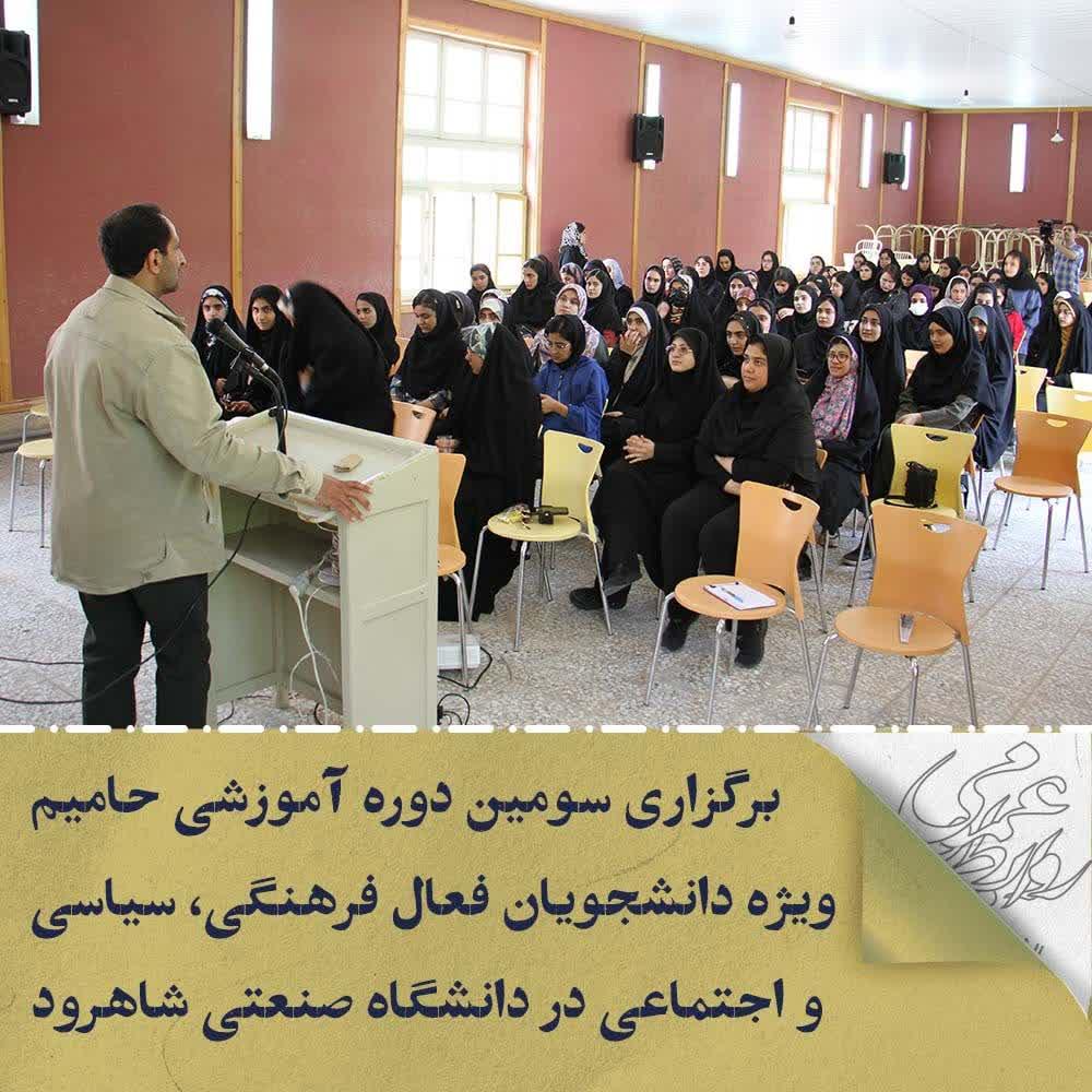 به گزارش روابط عمومی دانشگاه صنعتی شاهرود، سومین دوره آموزشی حامیم "حلقه های میانی فرهنگی جهت توانمند سازی دانشجویان فعال فرهنگی، سیاسی و اجتماعی" ویژه دانشجویان فعال فرهنگی، سیاسی و اجتماعی ورودی ۱۴۰۱ و ۱۴۰۲ به همت نهاد نمایندگی مقام معظم رهبری در دانشگاه در روزهای 27و28 اردیبهشت ماه جاری درمحل پردیس آموزشی دانشگاه همزمان با سراسر کشور برگزار شد.