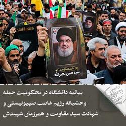 دانشگاهیان دانشگاه صنعتی شاهرود، در پی حمله وحشیانه رژیم صهیونیستی و قتل عام مردم مظلوم فلسطین و لبنان که منجر به شهادت سردار و سید جبهه مقاومت سیّد حسن نصرالله رضوانالله تعالی علیه و همرزمان شهیدش شد، این ترور و اقدام ضدانسانی را بهشدت محکوم مینماید.