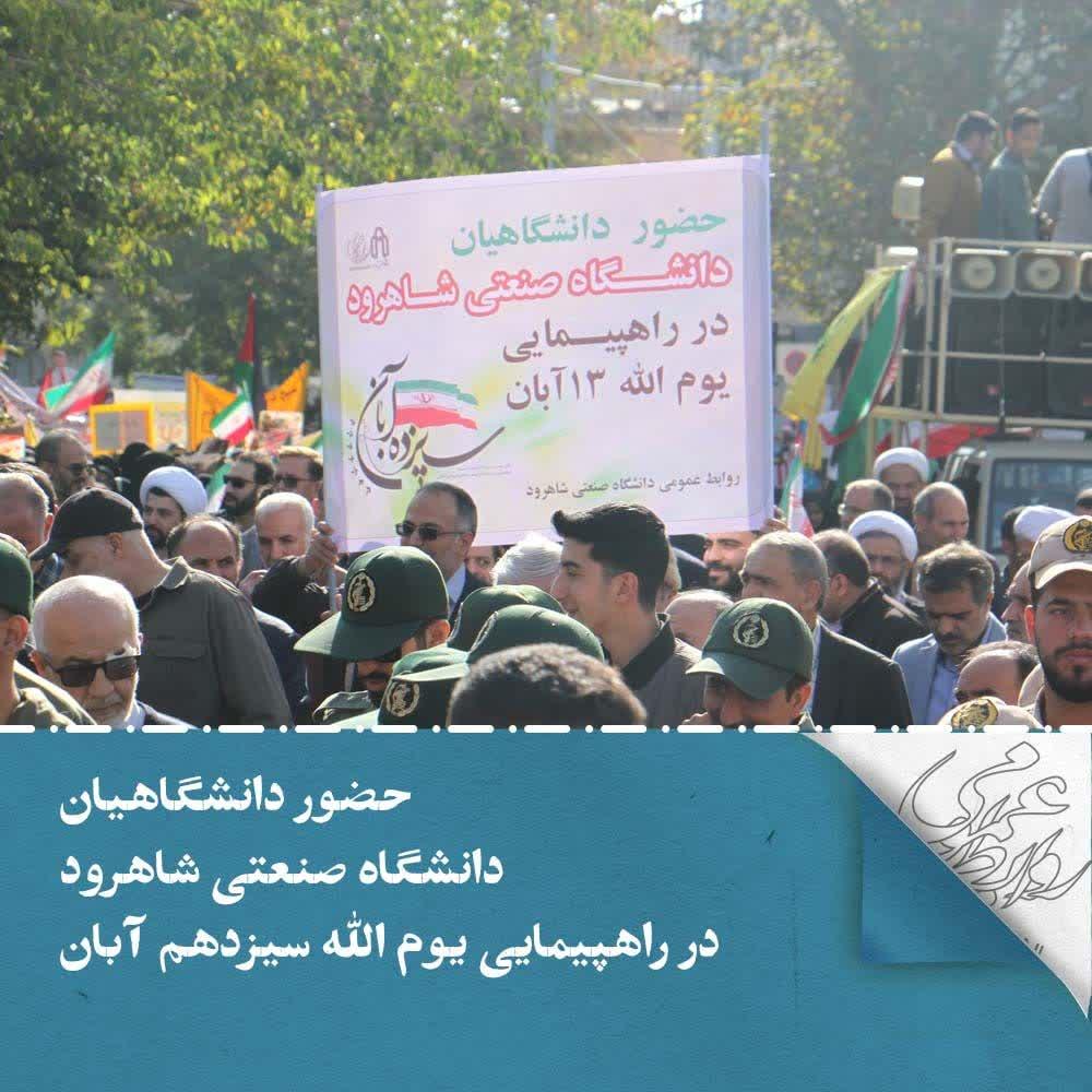 به گزارش روابط عمومی دانشگاه صنعتی شاهرود؛ راهپیمایی مراسم بزرگداشت ۱۳ آبان به مناسبت پاسداشت و بزرگداشت یاد و خاطره شهدای گرانقدر حوادث یومالله سیزدهم آبان، سالروز تسخیر لانه جاسوسی آمریکا و روز مبارزه با استکبار جهانی، با حضور اقشار مختلف مردم به ویژه دانش آموزان و دانشجویان در شهرستان شاهرود برگزار شد و دانشگاهیان این دانشگاه نیز هم گام با سایر اقشار جامعه و مردم خداجوی شاهرود با حضور در میدان جمهوری این شهرستان در این راهپیمایی انزجار خود را از جنایتهای آمریکا و اسرائیل اعلام نمودند.