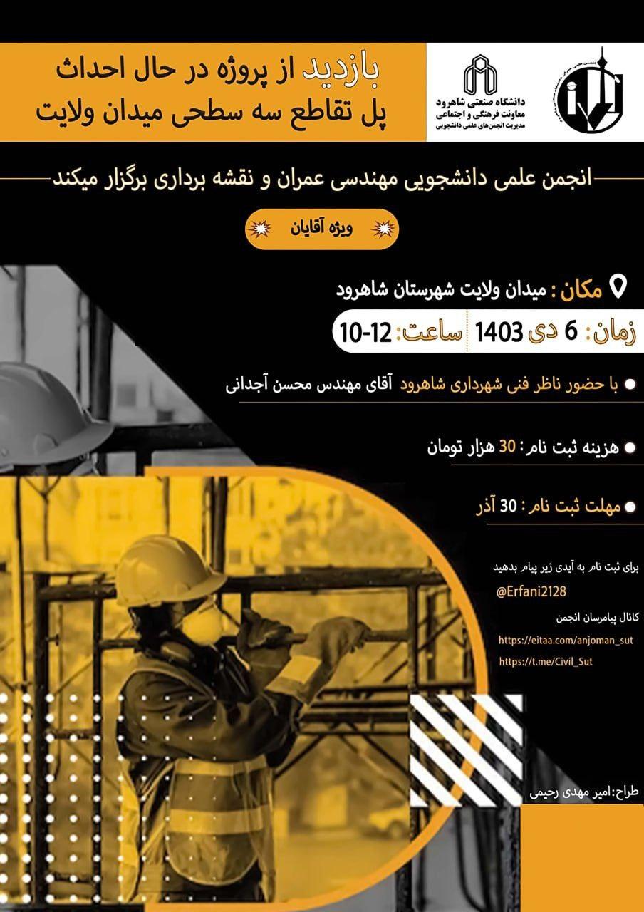 انجمن علمی دانشجویی مهندسی عمران و نقشه برداری دانشگاه صنعتی شاهرود بازدید از پروژه در حال احداث پل تقاطع 3 سطحی میدان ولایت ویژه آقایان را در تاریخ 6 دی ماه برگزار می کند. برای ثبت نام و کسب اطلاعات بیشتر به آیدی زیر پیام دهید :