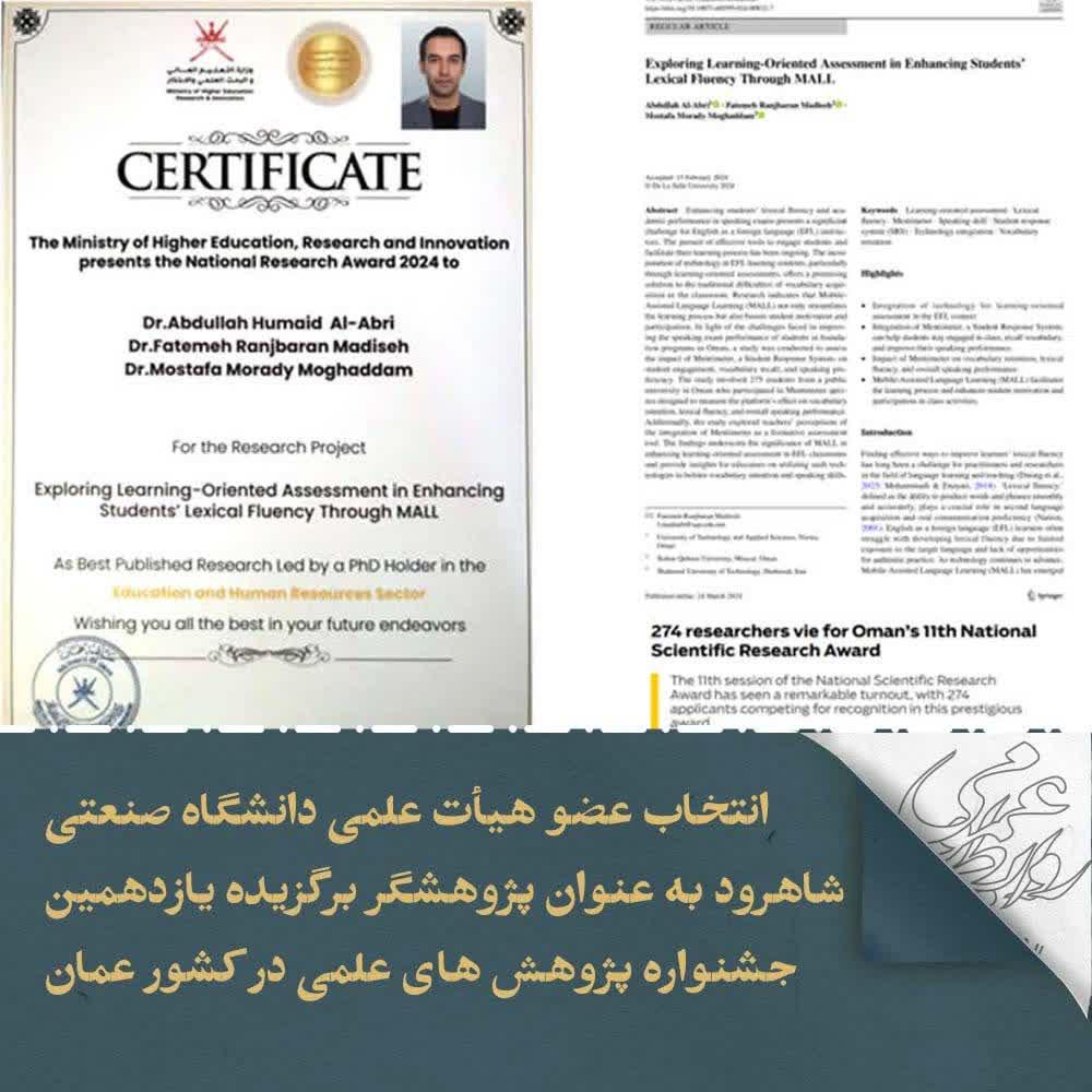 به گزارش روابط عمومی دانشگاه ، دکتر مصطفی مرادی مقدم عضو هیات علمی گروه زبان های خارجی دانشگاه در یازدهمین جشنواره پژوهش های علمی در کشور عمان با حضور 274 پژوهشگر، جایزه برگزیده بهترین تحقیق پژوهشی در بخش آموزش و منابع انسانی را دریافت نمود.