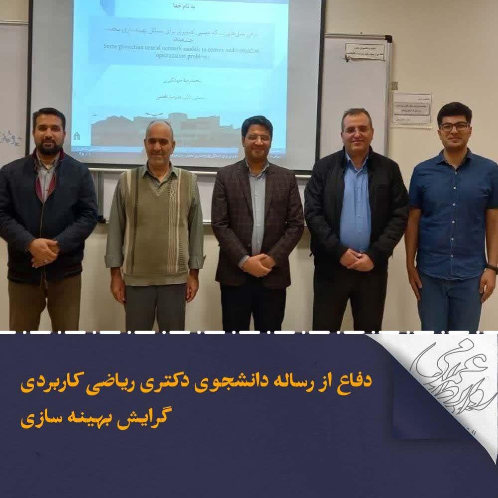 به گزارش روابط عمومی دانشگاه صنعتی شاهرود، محمدرضا جهانگیری دانشجوی دكتری ریاضی کاربردی گرایش بهینه سازی این دانشگاه در روز یکشنبه 16 دی ماه سال جاری از رساله خود تحت عنوان " برخی مدلهای شبکه عصبی تصویری برای مسائل بهینه سازی محدب چند هدفه " به راهنمایی دکتر علیرضا ناظمی استاد تمام و عضو هیات علمی گروه ریاضی کاربردی این دانشگاه دفاع نمود.