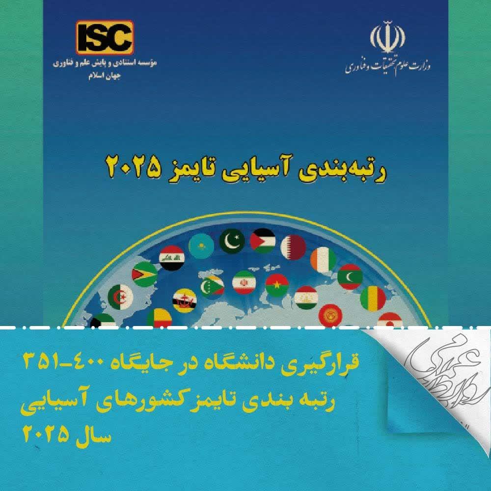 در رتبه بندی تایمز کشورهای آسیایی سال 2024 این دانشگاه در جایگاه 350-301 قرار گرفت و امید است با توسعه فعالیت های پژوهشی فناوری و نوآوری دانشگاه ها پژوهشگاه ها و مؤسسات پژوهشی کشور شاهد ارتقاء جایگاه دانشگاه در سطح ملی و بین المللی باشیم.