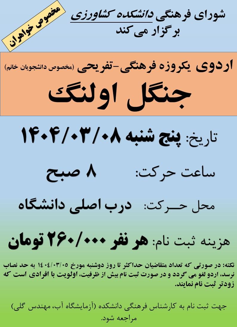 شورای فرهنگی دانشکده کشاورزی برگزار می کند. برگزاری اردوی فرهنگی-تفریحی از جنگل زیبای اولنگ، روز پنج شنبه مورخ 8 خرداد 1404 مخصوص دانشجویان دانشکده کشاورزی (خواهران)