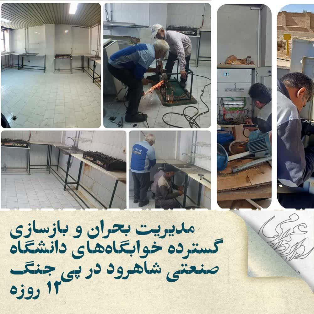 به گزارش روابط عمومی دانشگاه صنعتی شاهرود، دکتر حسین خسروی، معاون دانشجویی دانشگاه در گفتوگویی با روابط عمومی دانشگاه، با اشاره به شرایط جنگ ۱۲ روزه در کشور، اظهار داشت: در دوران حضور دانشجویان در خوابگاهها طی روزهای جنگ، مسئولین خوابگاهها و سرپرستان شیفت به طور مداوم در میان دانشجویان حضور داشتند. آنها با سرکشی مستمر از اتاقها و ارتباط مستقیم با دانشجویان، تلاش کردند با دعوت به آرامش، فضای روانی خوابگاهها را کنترل کرده و از بروز رفتارهای هیجانی نامطلوب پیشگیری کنند. همچنین حضور مشاوران در خوابگاهها افزایش یافت و به طور دائم در ارتباط با دانشجویان بودند و راهکارهایی برای مدیریت استرس ارائه دادند. خوشبختانه تخلیه خوابگاهها نیز در زمان مقرر به بهترین شکل ممکن انجام شد.