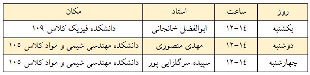 به اطلاع کلیه دانشجویان محترم می رساند برنامه کلاس های حل تمرین فیزیک 1 فنی مطابق جدول زیر تعیین شده است