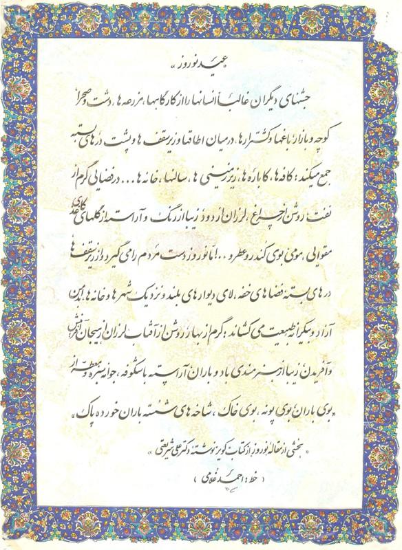 به مناسبت آغاز سال 1392 و بهار زیبای طبیعت، توصیف هنرمندانه عید نوروز در کلام مرحوم دکتر علی شریعتی که با اثر خوشنویسی همکار محترم آقای دکتر احمد غلامی عضو محترم هیأت علمی دانشکده کشاورزی ( در سال 1368 ) به زیبایی تحریر گردیده است را تقدیم به شما دانشگاهیان محترم می نمائیم: