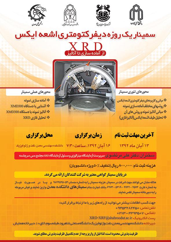 دانشکده مهندسی معدن، نفت و ژئوفیزیک دانشگاه شاهرود در نظر دارد سمینار یک روزه ای با عنوان دیفراکتومتری اشعه ی ایکس را با همکاری شرکت مس سرچشمه کرمان برگزار نماید. این سمینار شامل دوره عملی کار با دستگاه XRD (XMD300) نیز می باشد.
