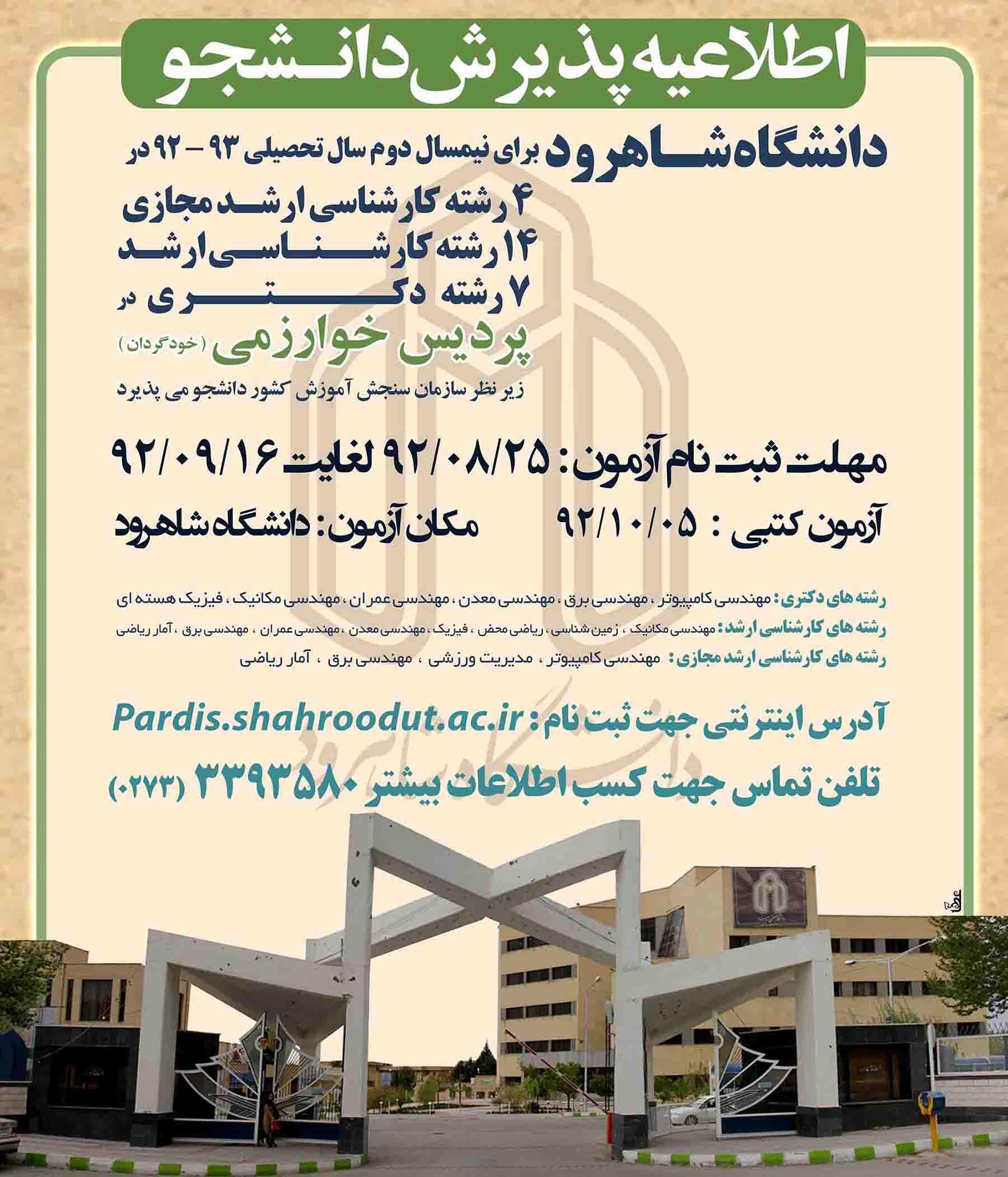 ثبت نام 25 رشته گرایش کارشناسی ارشد و دکترای تخصصی در مرکز آموزش های الکترونیکی (مجازی ) و پردیس خوارزمی دانشگاه شاهرود برای نیمسال دوم تحصیلی 93-92 از 25 آبان ماه آغاز می شود.