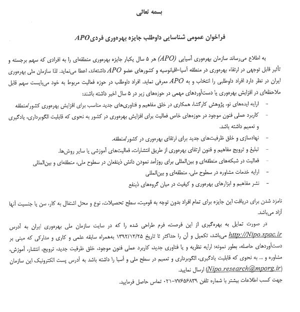 فراخوان عمومی شناسایی داوطلب جایزه بهره وری فردی APO