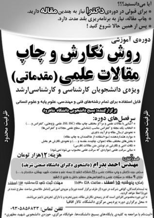 به همت بسیج دانشجویی دانشگاه شاهرود دومین دوره آموزشی روش نگارش و چاپ مقالات علمی (مقدماتی ) ویژه دانشجویان کارشناسی و کارشناسی ارشد و تمام رشته های فنی و مهندسی و علوم پایه و علوم انسانی در تاریخ 15 اسفندماه توسط احمد بدرام (دانشجوی دکترای دانشگاه صنعتی شریف و مدرس آموزش دوره نگارش و چاپ مقالات علمی در 11 دانشگاه کشور) برگزار می گردد.