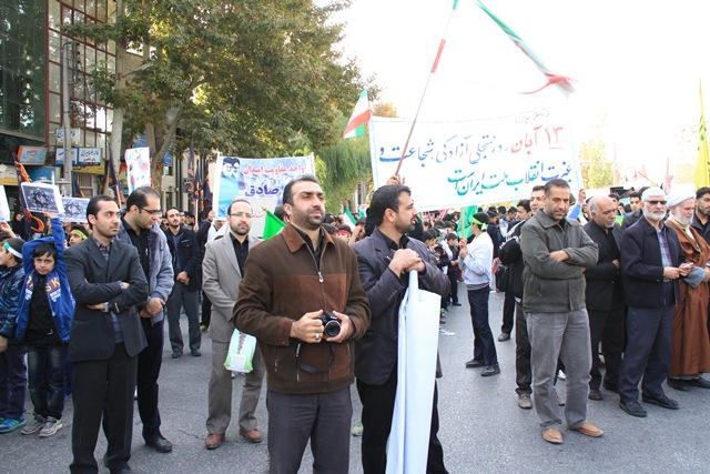 در این مراسم که صبح امروز یکشنبه در حد فاصل میدان امام و جمهوری اسلامی مقابل ساعت گل برگزار گردید، دانشگاهیان، دانش آموزان و مسئولان یک صدا شعار مرگ بر آمریکا و مرگ بر اسرائیل سر دادند و از جنایات و ددمنشی های استکبار جهانی و آمریکا و اسرائیل ابراز انزجار کردند.