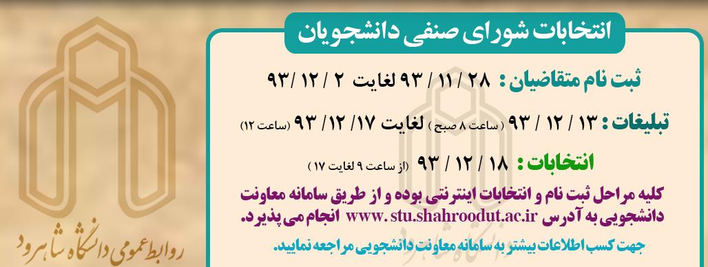 به گزارش روابط عمومی دانشگاه شاهرود، دکتر حجت احسنی طهرانی زمان ثبت نام در کاندیداتوری عضویت در شورای صنفی دانشگاه را از بیست و هشتم بهمن ماه سال جاری تا دوم اسنفد عنوان کرد.