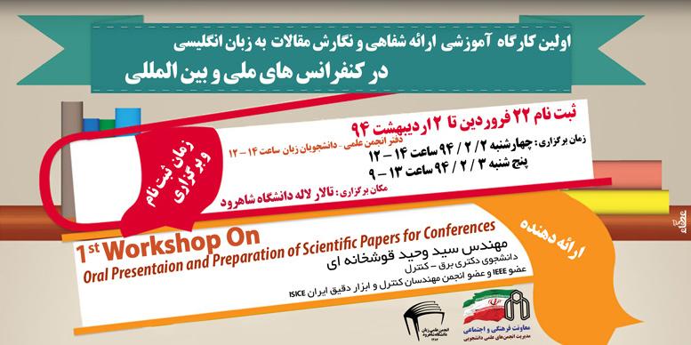 به گزارش روابط عمومی دانشگاه شاهرود، آیدا غروی افزود: کارگاه آموزشی ارائه شفاهی و نگارش مقالات به زبان انگلیسی، چهارشنبه و پنجشنبه دوم و سوم اردیبهشت ماه سال جاری به مدت دو روز در تالار لاله این دانشگاه برگزار خواهد شد.