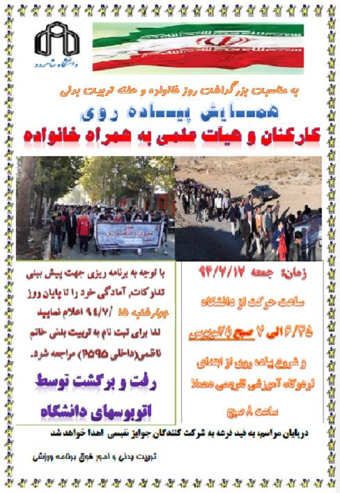 به گزارش روابط عمومی دانشگاه شاهرود، دکتر علی حسنی مدیر فوق برنامه ورزشی اعلام کرد: همایش پیاده روی هفدهم شهریور ماه سال جاری همزمان با بزرگداشت روز خانواده ویژه هیات علمی و کارمندان این دانشگاه به همراه خانواده برگزار می شود.