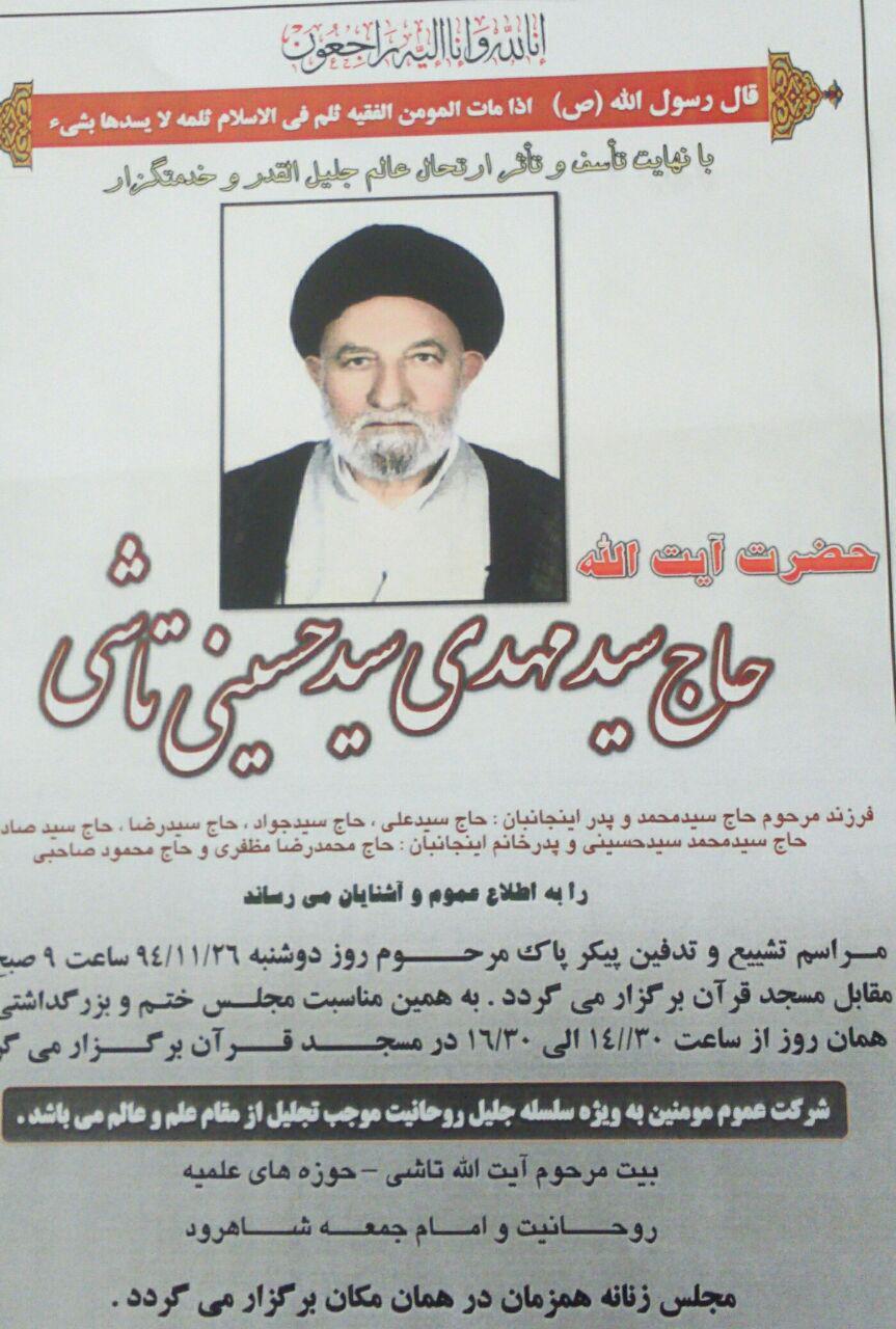 به گزارش خبرنگار مهر، آیت الله سید مهدی تاشی صبح یکشنبه در بیمارستان امام حسین(ع) شهرستان شاهرود درحالی دعوت حق را لبیک گفت که مدت های مدید با بیماری مبارزه می کرد و در نهایت همزمان با بیست و پنجمین روز از بهمن ماه ۹۴ دعوت حق را لبیک گفت.
