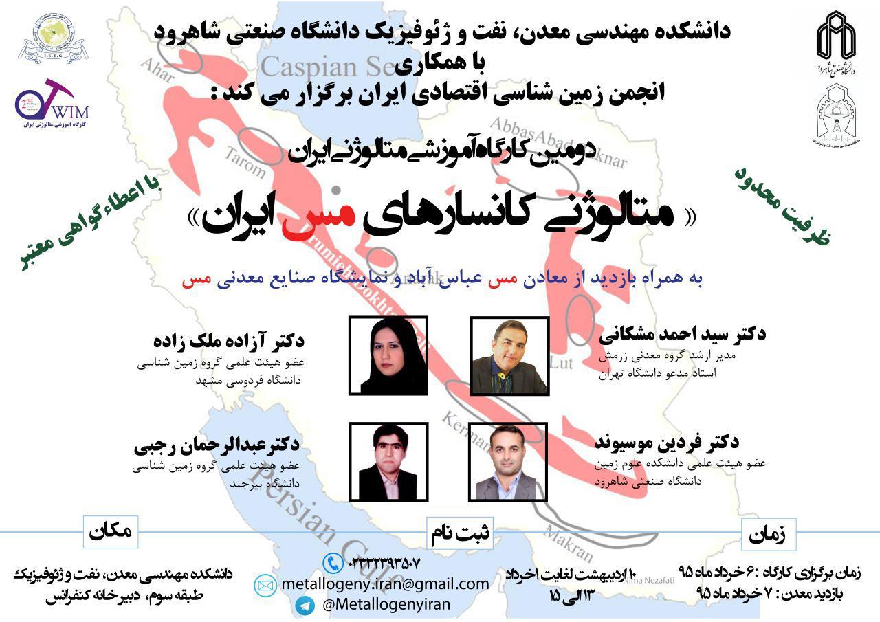 دانشکده مهندسی معدن، نفت و ژئوفیزیک دانشگاه صنعتی شاهرود با همکاری انجمن زمین-شناسی اقتصادی ایران دومین کارگاه آموزشی متالوژنی ایران، با موضوع تخصصی "متالوژنی کانسار های مس ایران" را در روز 6 خرداد 95، برگزار می کند.
