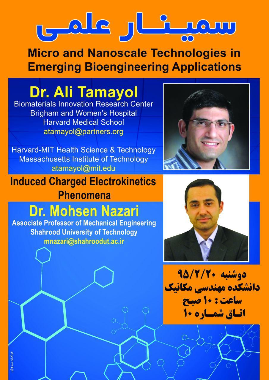 در این سمینار، دکتر محسن نظری دانشیار دانشکده مهندسی مکانیک دانشگاه صنعتی شاهرود و علی تمایل عضو انستیتوی تکنولوژی علوم بهداشت هاروارد (MIT) در رابطه با "تکنولوژی های علمی در مقیاس خرد و نانو و کاربردهای آن در فوریت های مهندسی زیستی" سخنرانی کردند.