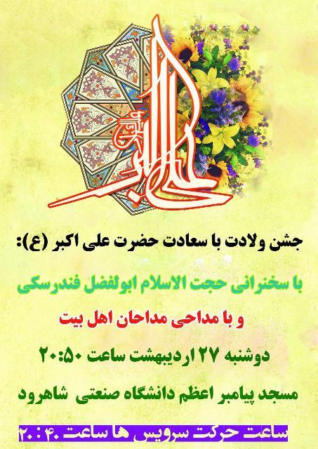 به گزارش روابط عمومی دانشگاه صنعتی شاهرود، جشن میلاد حضرت علی اکبر(ع)، دوشنبه بیست و هفتم اردیبهشت ماه ساعت 20 و 50 دقیقه در مسجد پیامبر اعظم(ص) این دانشگاه برگزار می شود.