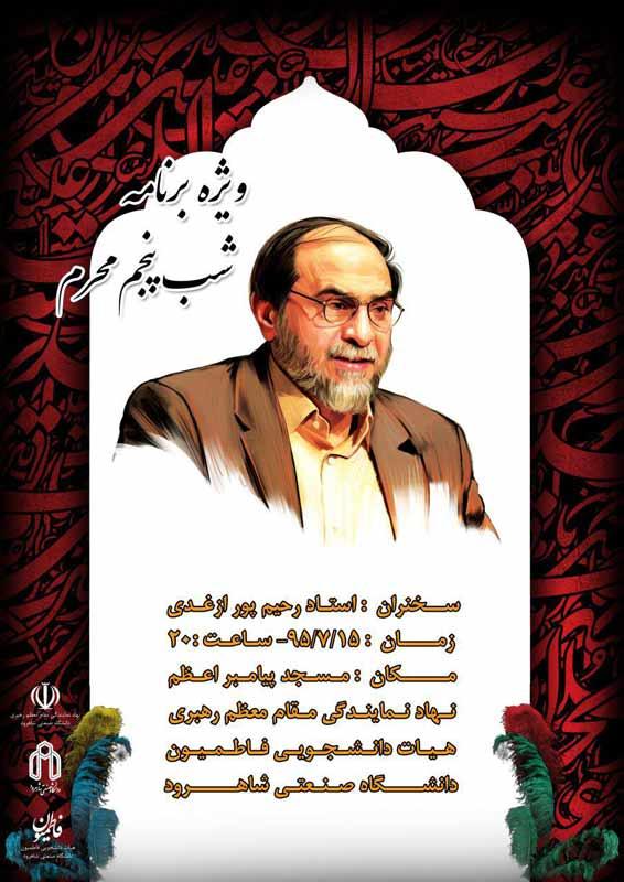 به گزارش روابط عمومی دانشگاه صنعتی شاهرود، به مناسبت فرا رسیدن ماه محرم و ایام عزاداری سیدالشهدا اباعبدالله الحسین علیه السلام ویژه برنامه شب پنجم محرم پنج شنبه 15 مهرماه ساعت 20 ، با حضور استاد رحیم پور ازغدی در مسجد پیامبر اعظم این دانشگاه برگزار می شود.