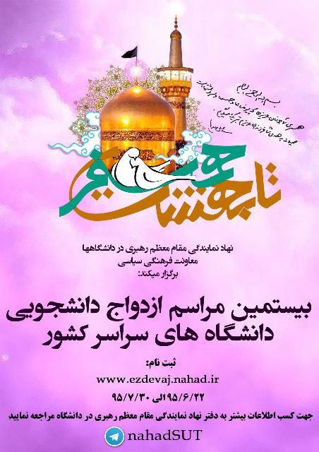 زمان ثبت نام از تاریخ 22 شهریور الی 30 مهرماه 95 می باشد جهت کسب اطلاعات بیشتر به دفتر نهاد نمایندگی مقام معظم رهبری در دانشگاه مراجعه نمایید.