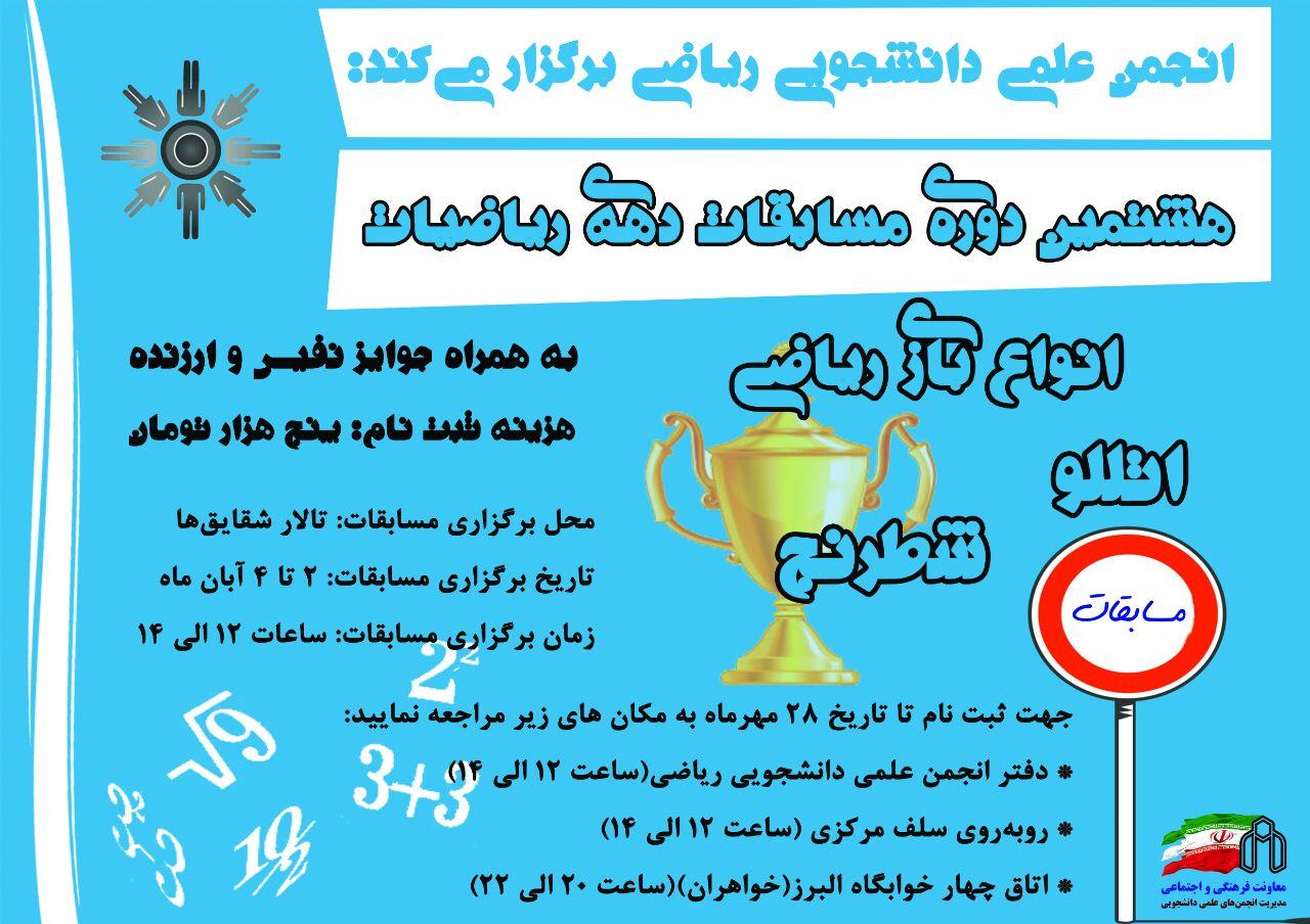 به گزارش روابط عمومی دانشگاه صنعتی شاهرود، انجمن علمی دانشجویی ریاضی هشتمین دوره مسابقات دهه ی ریاضیات را در این دانشگاه برگزار می نماید.