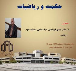 اين نشست كه با سخنراني دكتر مهدي ايرانمنش هيات علمي دانشكده علوم رياضي دانشگاه همراه خواهد بود به سوالاتي از قبيل حكمت چيست؟ و رياضيات چه ارتباطي با حكمت دارد؟ فرق رياضيات با ساير علوم در چيست؟ آيا رابطۀ رياضيات و حكمت يك رابطۀ ضروري است يا رياضيات صرفا زمينه اي را براي حكمت فراهم ميكند؟ و چرا؟ چرا اين ويژگي در رياضيات و فلسفه نسبت به ساير علوم بيشتر است؟ ساحات وجود انسان كدامند و حكمت به كداميك از ساحات آدمي مربوط است؟ چگونه است كه در گذشته حكيم بسيار داشتيم و اكنون نه؟ چرا حكمت گمشدۀ ماست؟ شهود چيست؟ چند معنا براي شهود؟ رابطۀ شهود و رياضيات و حكمت كدام است؟ تخيل چيست؟ نقش تخيل در علوم و رياضيات و اهميت تخيل در چيست؟ چگونه فردي كه با منطق و رياضيات سروكار دارد ميتواند راهي بسوي حكمت بيابد؟ پاسخ داده خواهد شد.