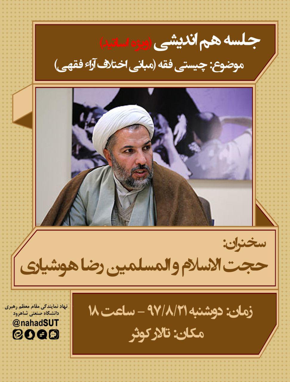 دفتر نهاد نمایندگی مقام معظم رهبری جلسه هم اندیشی ویژه اساتید را با موضوع چیستی فقه(مبانی اختلاف آراء فقهی) درروز دوشنبه 21 آبان ساعت 18 درتالار کوثر دانشگاه صنعتی برگزار می کند.