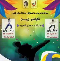 لازم به ذكر است مسابقات تكواندو پومسه قهرمانی دانشجویان پسر دانشگاه های كشور نیز در دانشگاه صنعتی شاهرود از تاریخ 22 لغایت 24 اسفند 97 برگزار می گردد.