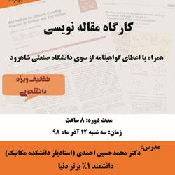 به اطلاع دانشجويان تحصيلات تكميلی می رساند كارگاه مقاله نويسی را در روز سه شنبه 98/9/12 با حضور جناب آقای دكتر محمدحسين احمدی، استاديار دانشكده مهندسی مكانيك برگزار می گردد جهت ثبت نام و شركت در كارگاه به سايت مركز آموزشهایآزاد به نشاني ذيل مراجعه فرماييد.