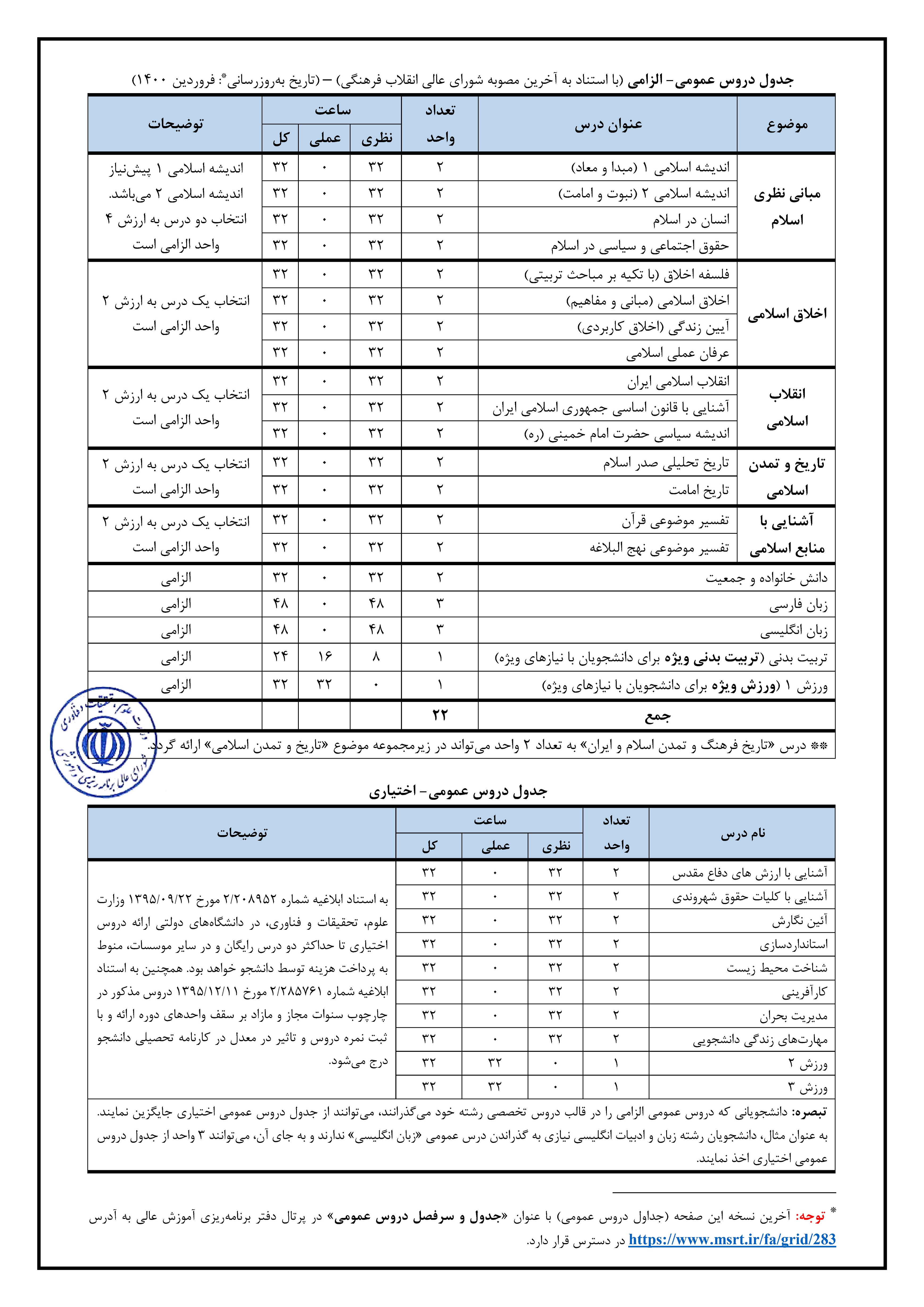 جدول دروس عمومی برای دانشجویان کارشناسی