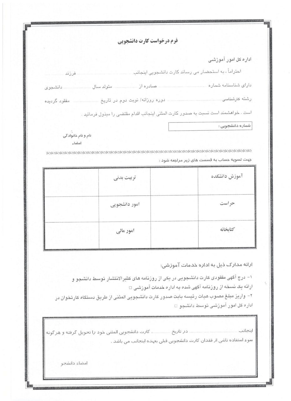 1-فرم را تکمیل و امضا های مربوط به ادرات درج شده در جدول را اخذ نمایید. 2-اطلاعیه مفقودی در روزنامه چاپ گردد 3-نسخه چاپ شده اطلاعیه مفقودی در روزنامه به همراه فرم به آموزش کل تحویل و جهت دریافت کارت اقدام شود